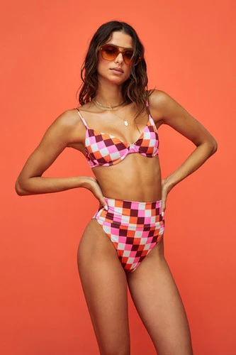 - checkered pattern in bold retro colors gives this 70s bikini top gives an exclusive throwback appeal
