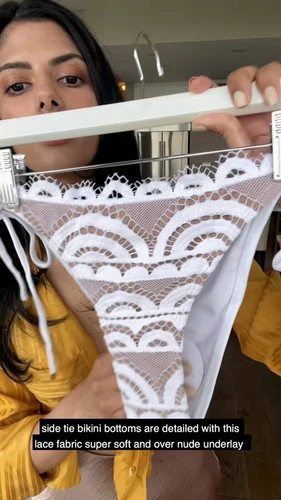 - signature soft scalloped lace fabric over a nude underlay, these white lace bikini bottoms make you look exclusively high-end