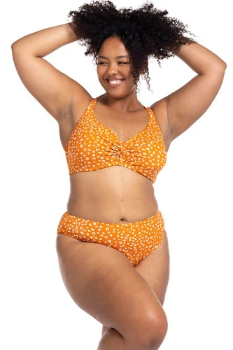 Ruched detail on this underwire bikini top gives a sultry spin to a classic bikini silhouette. The tummy control bikini bottoms have a classically seductive hourglass silhouette A vibrant orange hue instantly puts you in the mood for a sunset cocktail in a paradise oasis