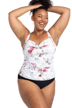 Ruching and roses are an eye-candy combination that's irresistible. A breathtaking look for an exclusive resort event. This cute tankini top has every guest in awe of your elegance