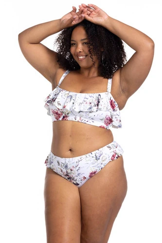 white ruffle bikini top is detailed with feminine frills along the neckline to enhance your bust. Flowy frills are perfect for adding volume to a smaller chest
