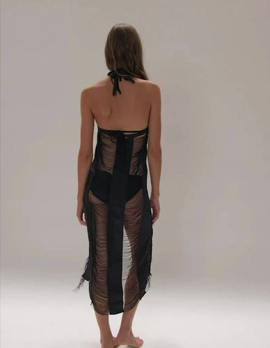 fringe cover up showcases unique & sexy peek-a-boo cutout details that allow your designer swimsuit to show through