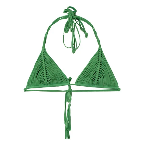 A striking yet elegant macramé finish imparts an air of edgy, statuesque glamour to your look. This triangle bikini top in rich green is the epitome of tropical vacations