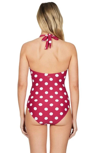 - deep V- neckline adds beautiful, ultra-feminine appeal to this retro polka dot swimsuit