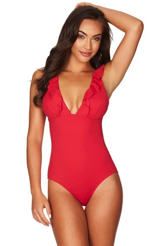 - ruffle deep v neckline adds a modern touch to this timeless swimsuit design
