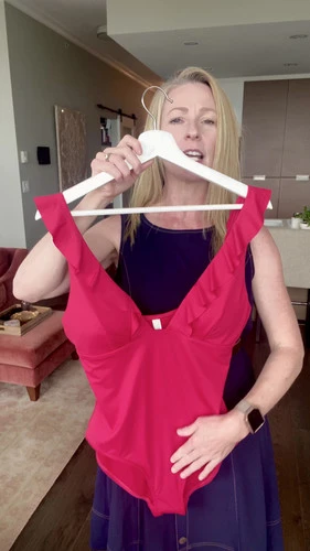 - the open neckline of this red swimsuit has a lengthening effect on the torso for a slimmed look